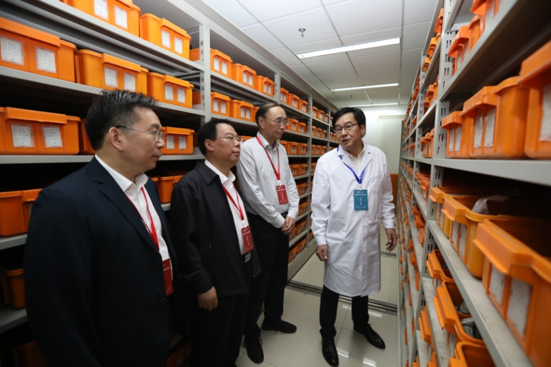 On September 28, The Undergraduate Teaching Assessment Team of the Ministry of Education (MOE) visited National Infrastructure of Mineral, Rock and Fossil for Science and Technology (NIMRF) of China University of Geosciences – Beijing (CUGB). Accompanied by the CUGB Party Secretary Lei Yalin, the University President Zhao Zhidan, Vice President Liu Damon and other faculties, the Undergraduate Teaching Assessment Team visited the core repository of the International Continental Scientific Drilling Program (ICDP), the Songke 1 and 3 Wells, the rock, mineral, and fossil speciments banks, and the research laboratories. The team conducted a thorough inquiries and in-depth examinations on the physical and digital management of the speciments and the sharing system of the resources. Professor He Mingyue, the head of the NIMRF, introduced the construction and development progress of the NIMRF, the daily management and operation model, and specific practices and experiences on how to effectively integrate specimen resources into undergraduate teaching programs to provide students more practical experiences with a physical and digital learning platform.